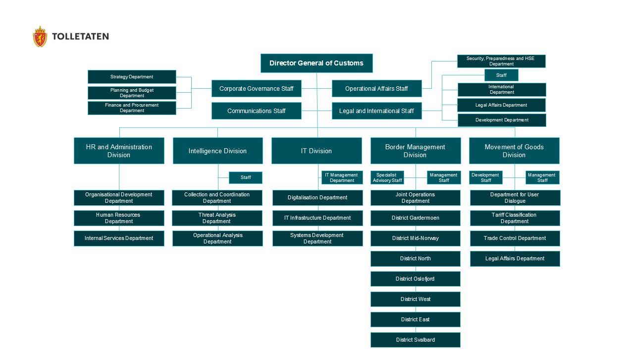 Organizational chart for the entire Norwegian Customs as of May 2024, with divisions and departments. Some departments also have underlying sections, see the pdf for a complete overview.