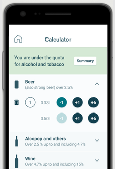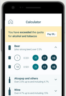 With the Norwegian Customs app you may calculate the quota for alcohol, tobacco products and other goods. You may easily declare and pay taxes in the app.