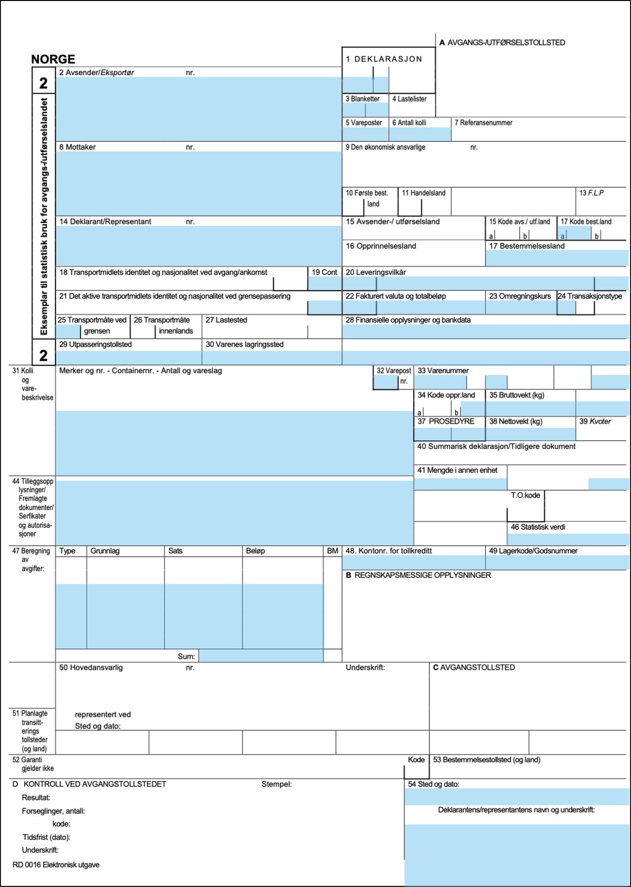 Her finner du hjelpetekster for utfylling av en utførselsdeklarasjon (tolldeklarasjon). Du deklarerer en vare ved å fylle ut en utførselsdeklarasjon. Dokumentet som fylles ut kalles enhetsblanketten eller SAD-dokumentet. Alle varer som skal eksporteres ut av landet, skal deklareres.