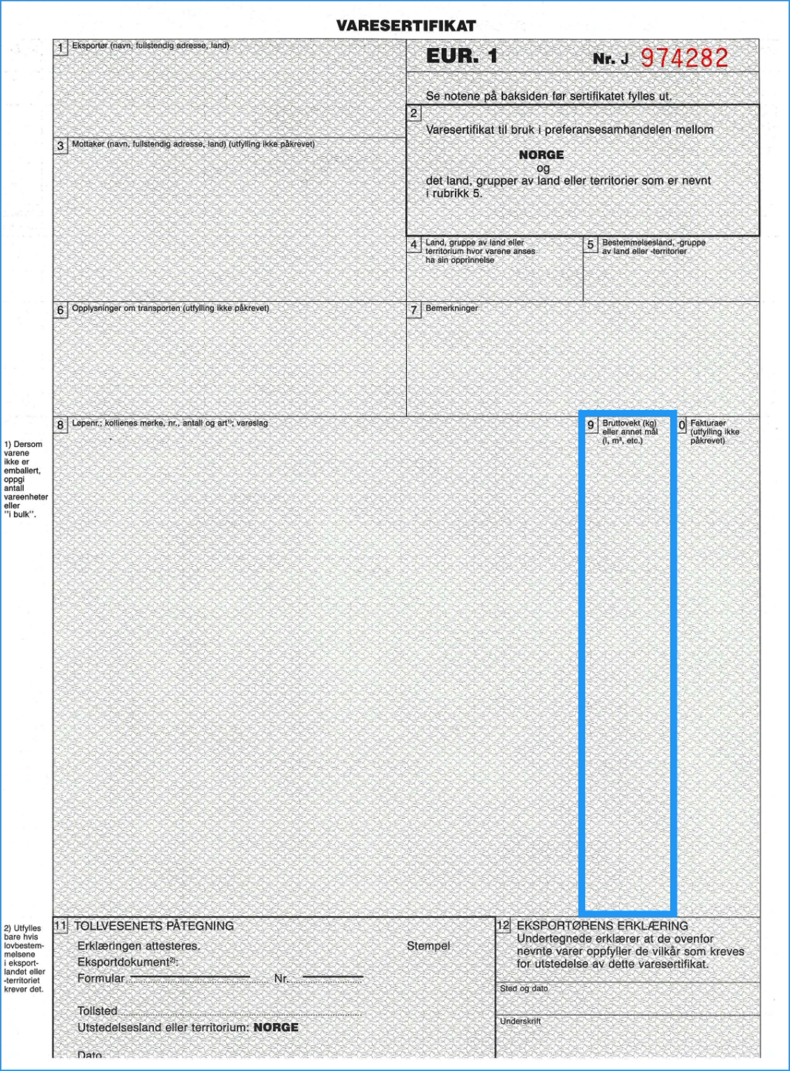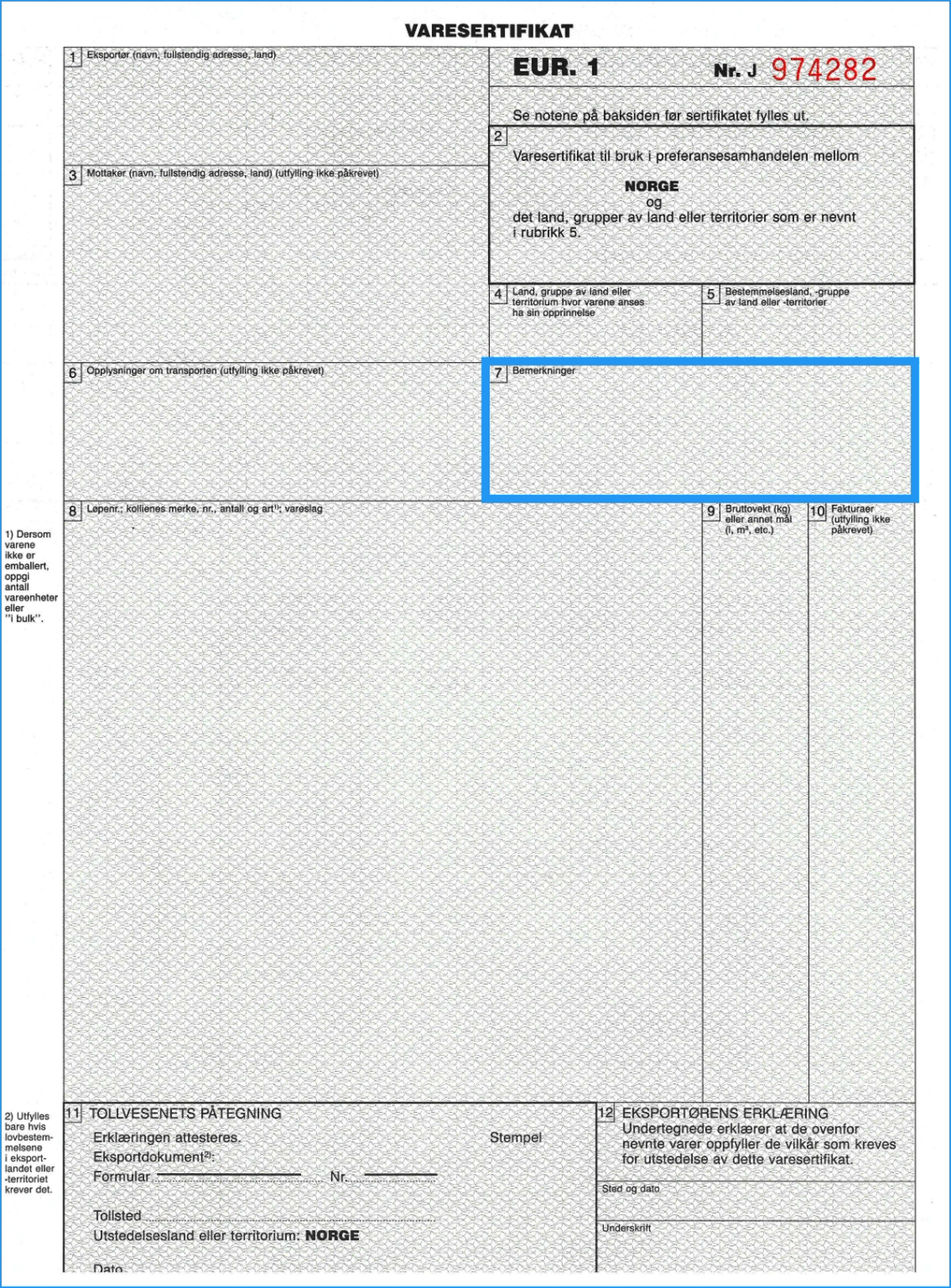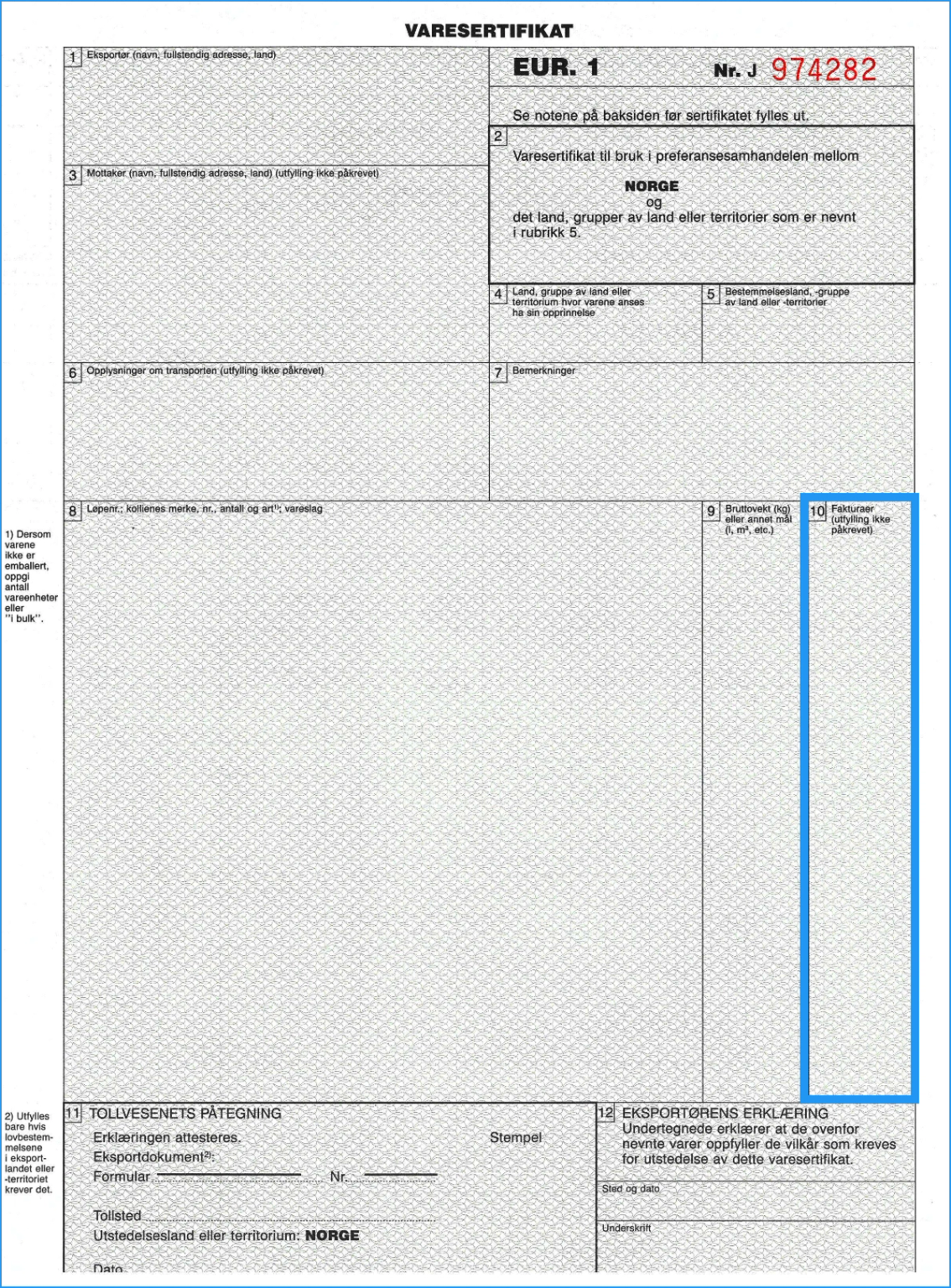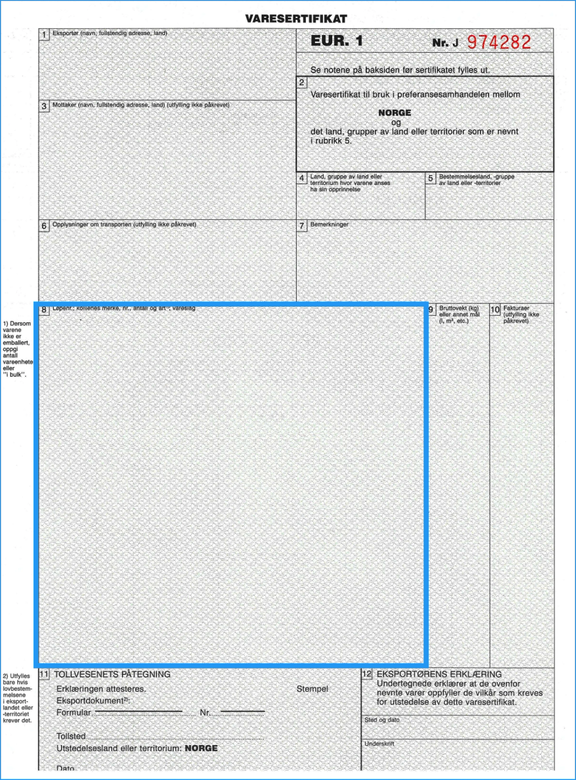 Merk at dette kun er et eksempel på varesertifikat. Utfylling av rubrikk 8, 9 og 10 skal skje med enkel linjeavstand slik at det er umulig å legge til noe mellom linjene. Hvis rubrikken ikke blir fylt helt ut, skal det rett under siste linje av vareskildringen trekkes en horisontal strek og den ubrukte plassen krysses ut diagonalt.