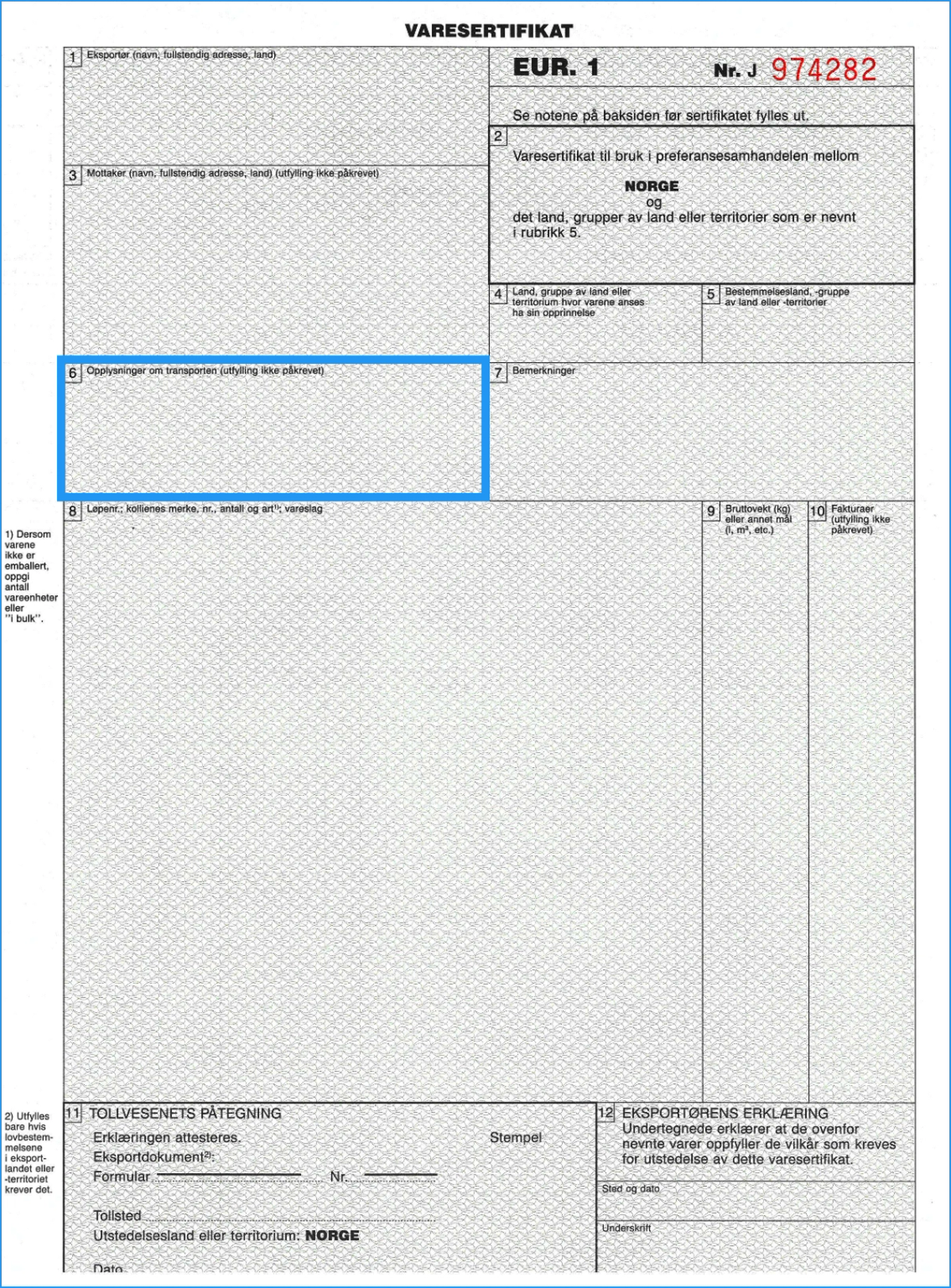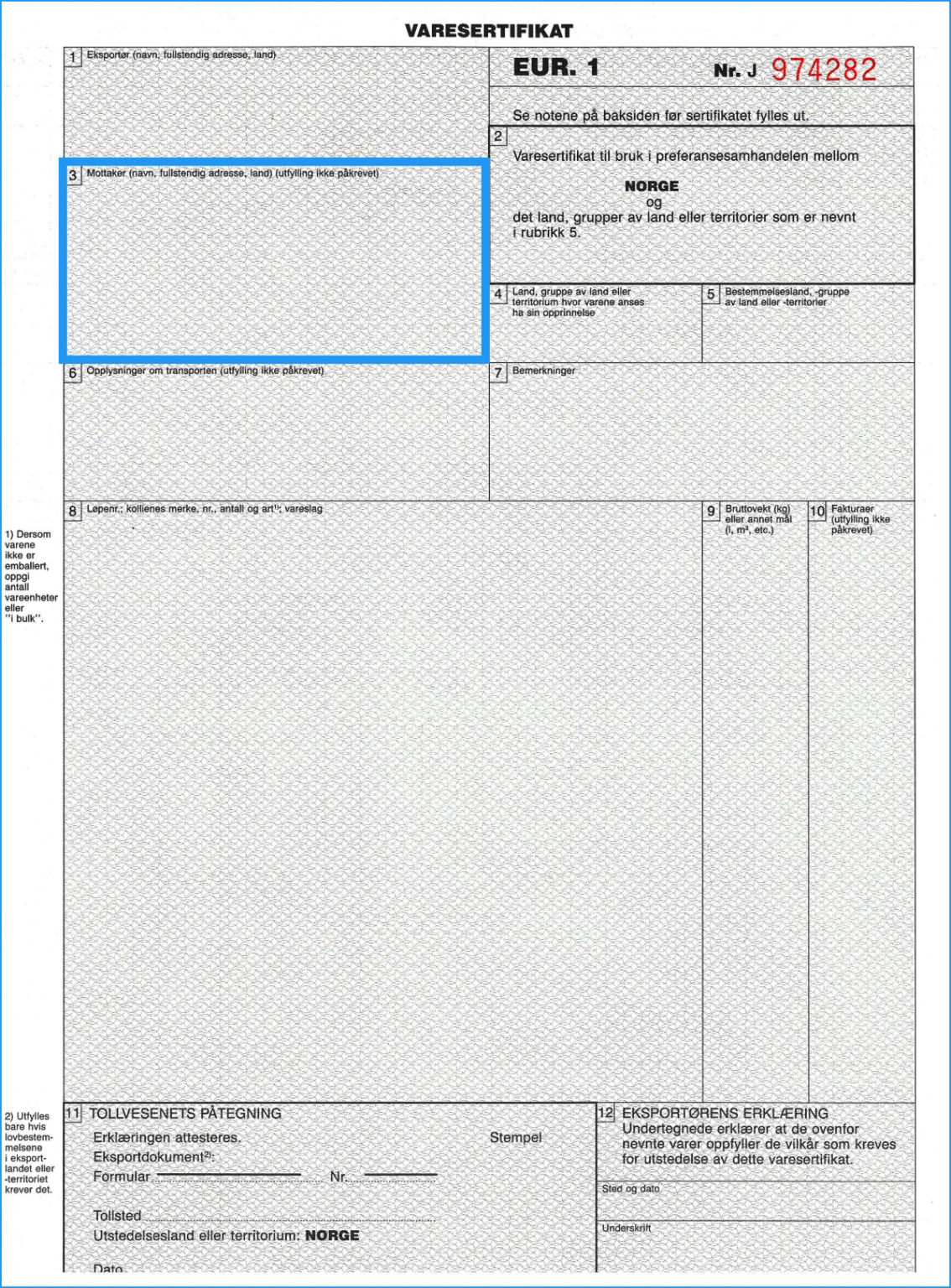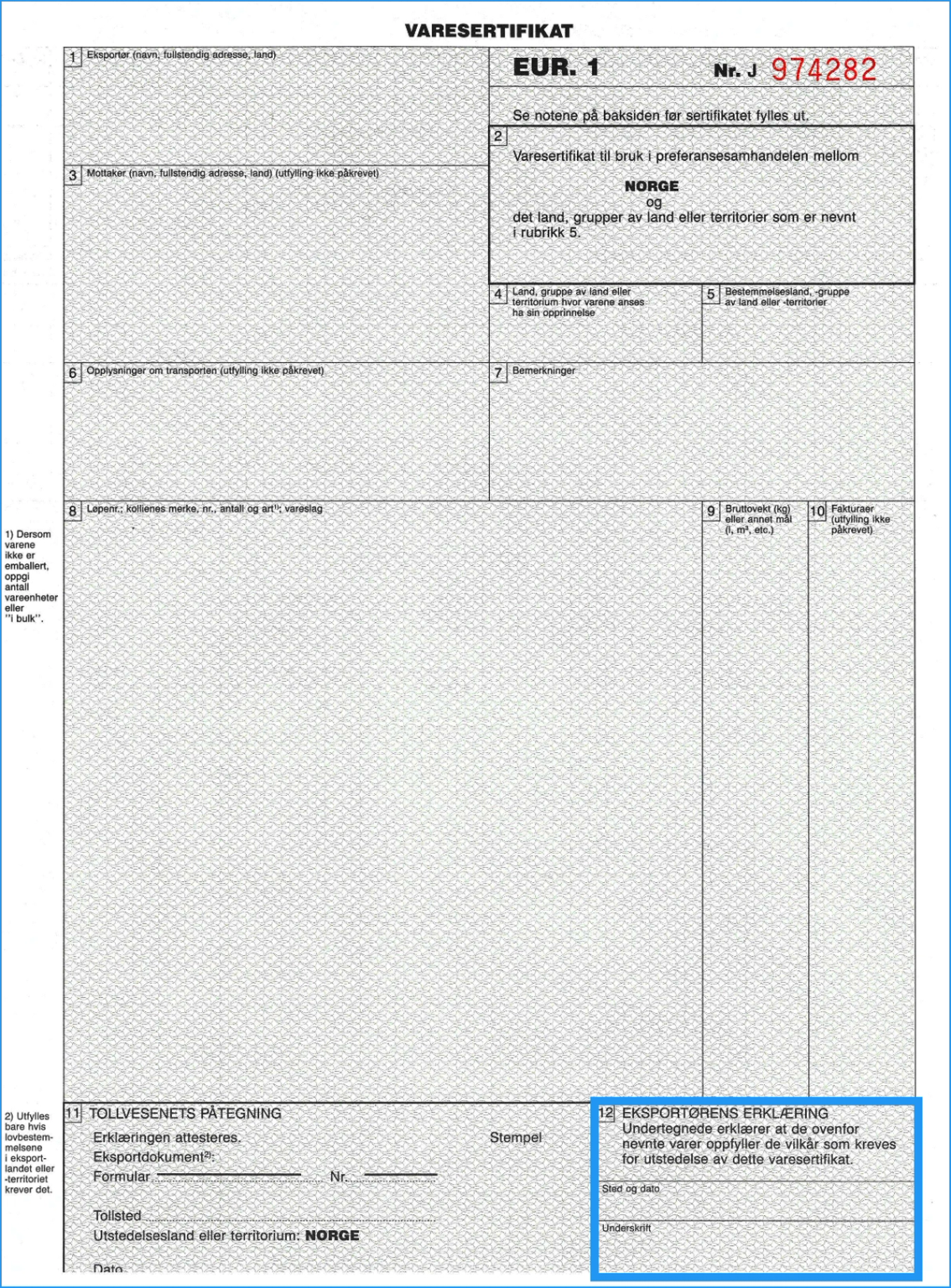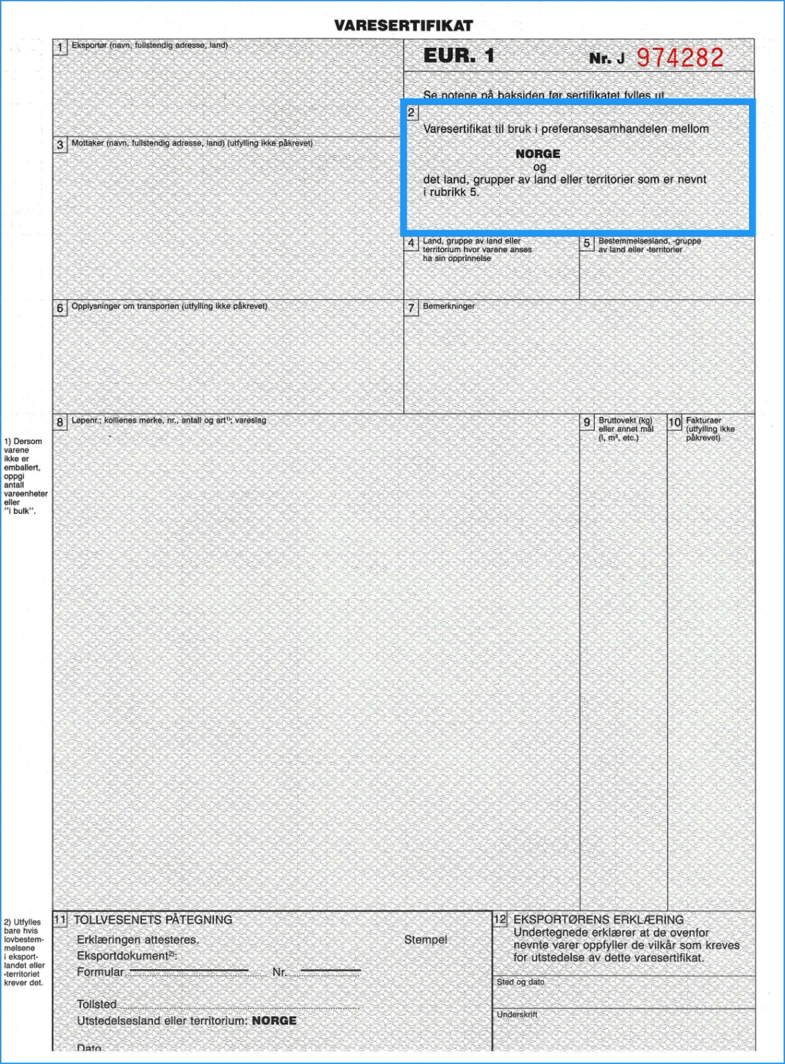 Merk at dette kun er et eksempel på varesertifikat. Utfylling av rubrikk 8, 9 og 10 skal skje med enkel linjeavstand slik at det er umulig å legge til noe mellom linjene. Hvis rubrikken ikke blir fylt helt ut, skal det rett under siste linje av vareskildringen trekkes en horisontal strek og den ubrukte plassen krysses ut diagonalt.