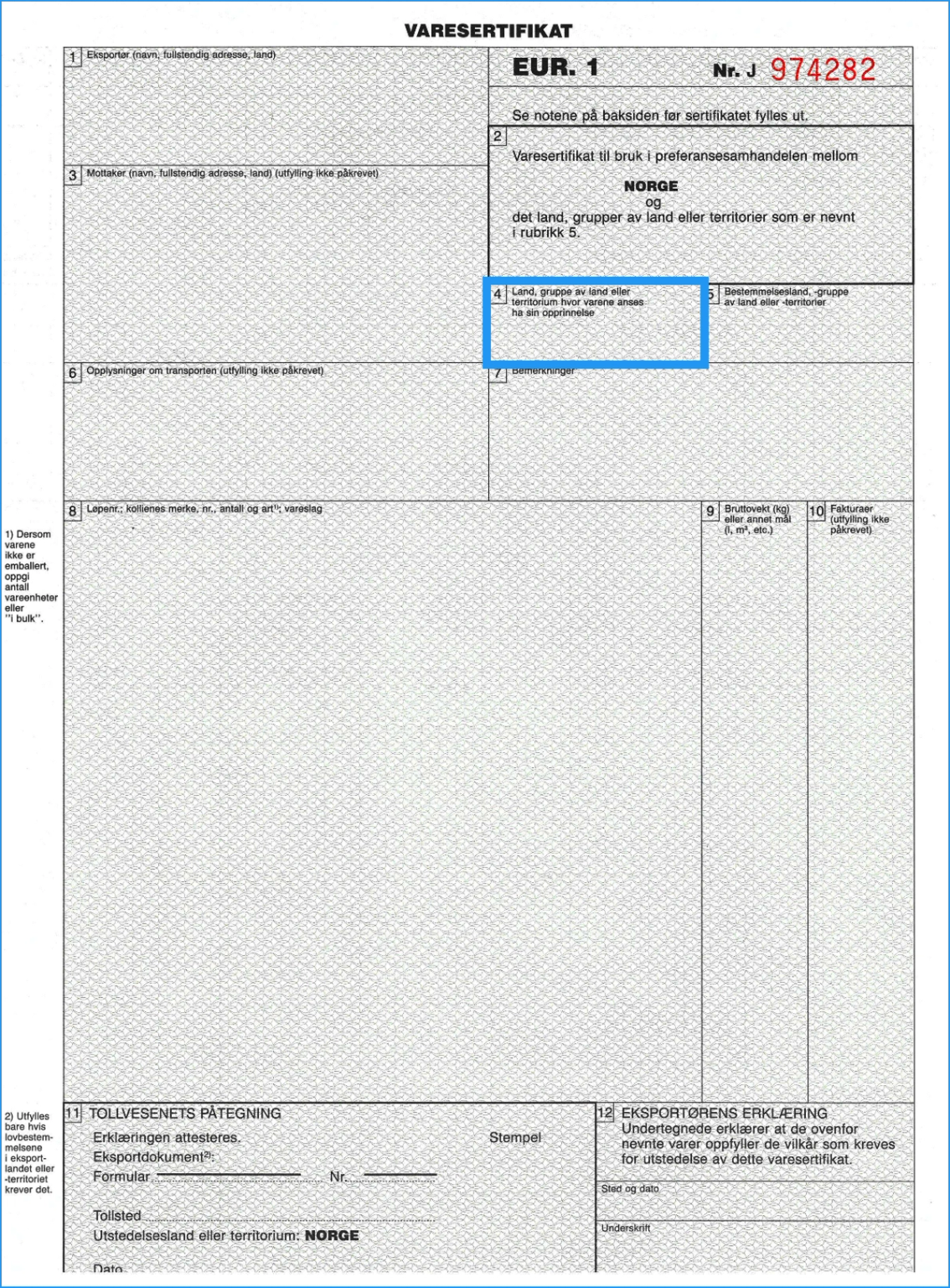- Hvis beviset utstedes i henhold til andre frihandelsavtaler, skal landet hvor produktet anses å ha sin opprinnelse i henhold til reglene i den aktuelle avtalen, for eksempel "Norge", oppgis i denne rubrikken. Her skal det oppgis hvor varene har sitt opphav i henhold til opphavsreglene.