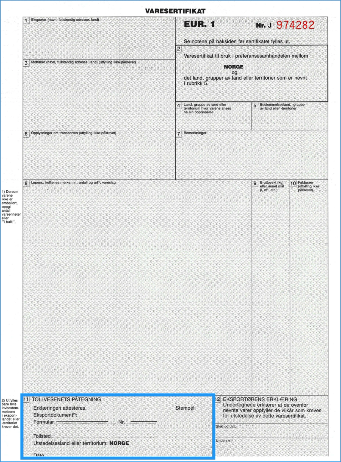 Rubrikk 11: Tollinformasjon (eksportlandet)