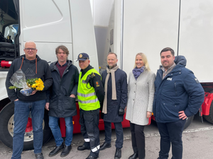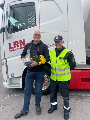 Patrik Andersson fra LRN transport ble førstemann som krysset grensen med Digitoll på ferge. Han ble møtt av NRK og flere journalister, men i mylderet stod også Atle Kjelsrud, førstetollinspektør i Tolletaten med blomster og konfekt!