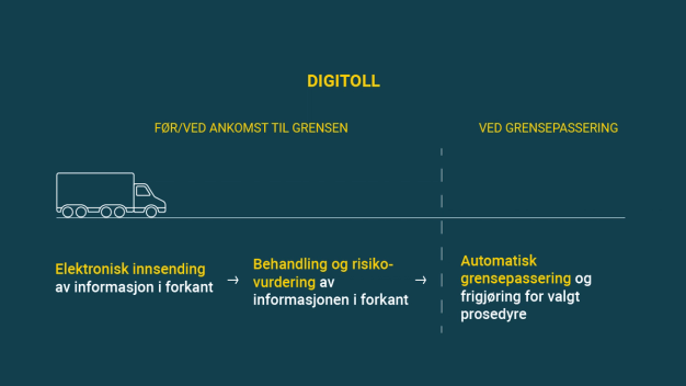Tolletatens planer er at innføringen av digitoll skjer trinnvis. Vi oppfordrer næringslivet til å ta i bruk digitoll så tidlig som mulig slik at de kan tilpasse egne systemer og arbeidsprosesser og gjøre nødvendige justeringer før direktekjøringsordningen avvikles og det innføres plikt til digital oppfyllelse av melde- og opplysningsplikten.