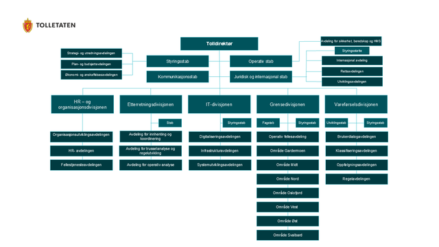 Organisasjonskart for heile Tolletaten frå 16. september 2024, med divisjonar og avdelingar. Enkelte avdelingar har også underliggjande seksjonar, sjå organisasjonskartet i pdf for fullstendig oversikt.