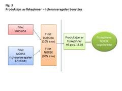 Dømet i fig. 3 er toleranseregelen brukt ved produksjon av dei norske filetane, men dette forhindrar ikkje at han kan brukast når filetane inngår i ein produksjon av ei ny vare som til dømes fiskepinnar. Dette følgjer av prinsippet om at når ei vare har oppnådd opphav i samsvar med opphavsreglane i ein avtale, kan denne opphavsvara fritt brukast i vidare produksjon.